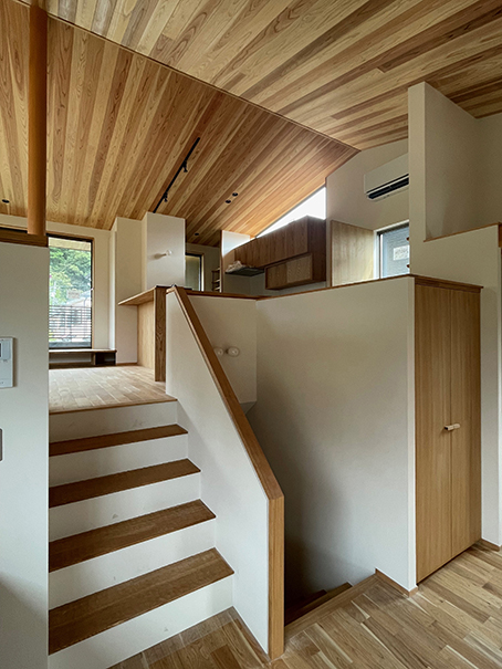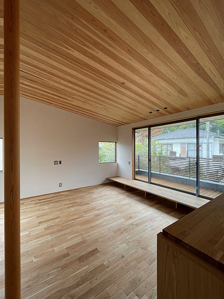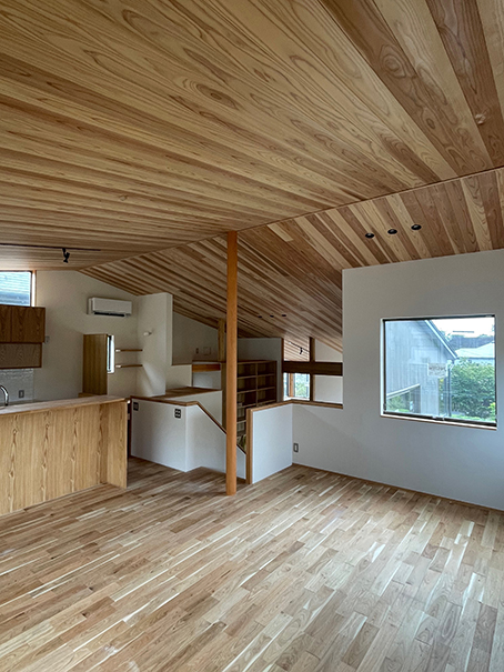 大らかな大屋根の家で、勾配天井には杉の縁甲板を貼っています。