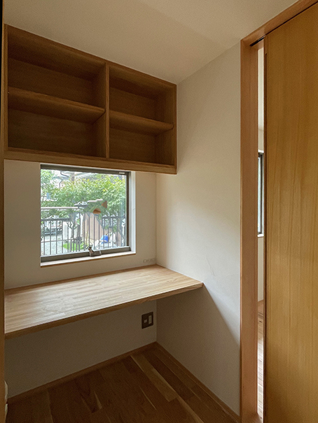 正方形の窓が南側で、光を採り入れ、近隣住宅の植栽も目に入ります。
